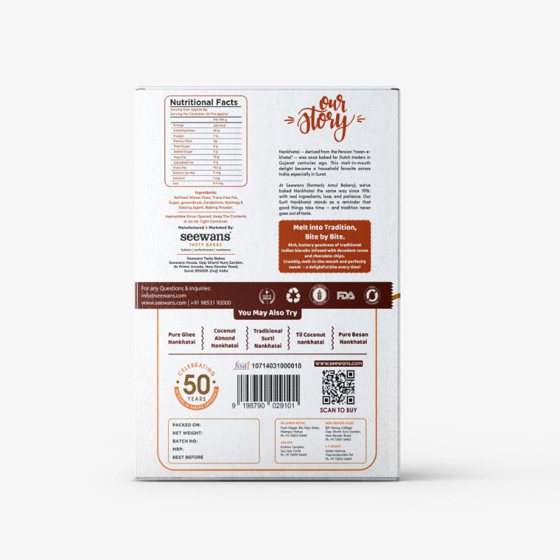 Indulge in the rich and delightful world of Chocolate Nankhatai by Seewans, where we've seamlessly blended the traditional charm of Nankhatai with the irresistible allure of chocolate. These delectable biscuits boast a crumbly and melt-in-the-mouth texture, making each bite a moment of pure bliss. The infusion of cocoa and chocolate chips adds a luxurious cocoa flavor and a delightful chocolatey crunch that perfectly complements the buttery sweetness. Whether enjoyed with a cup of hot tea or coffee or savored as a standalone dessert, Seewans' Chocolate Nankhatai is a heavenly indulgence that elevates the joy of every bite. Dive into the world of tradition and chocolatey decadence with each exquisite piece of this beloved Indian treat.