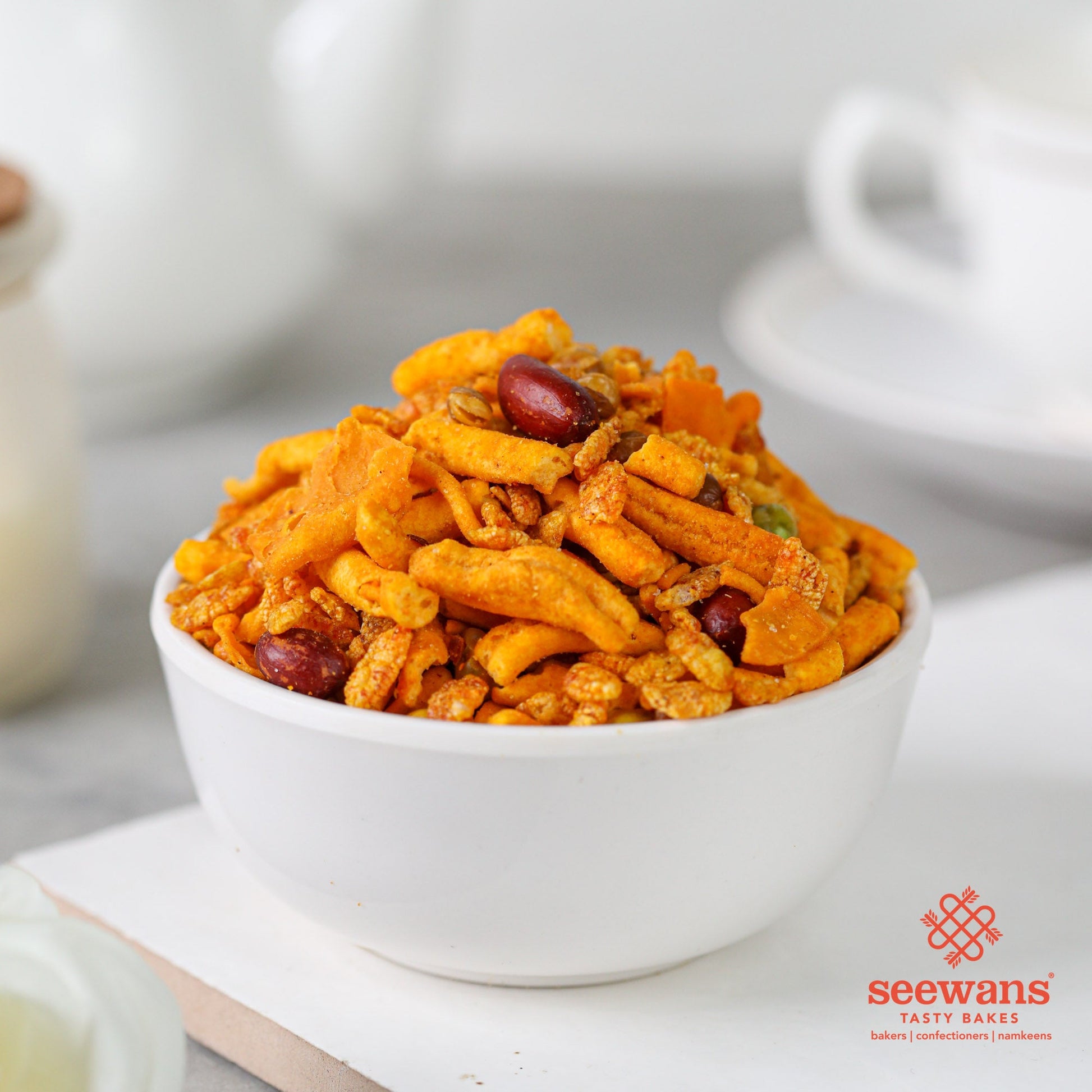 "Indulge in the vibrant and fiery flavors of Seewans' Traditional Surti Tikha Mix Namkeens. Handcrafted with expertise and love, this authentic snack captures the essence of Surat, delivering a thrilling combination of spicy and savory tastes that are sure to awaken your palate and transport you to the heart of the city's culinary traditions."