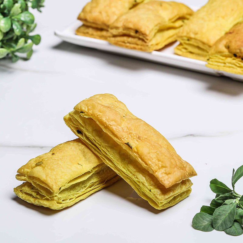 pure butter, each bite unveils a harmonious marriage of crispy, flaky layers and the aromatic freshness of methi leaves. This savory treat is not just a snack its a flavorful journey that perfectly complements your morning tea, adding a touch of warmth and tradition to your breakfast routine. Embrace the savory indulgence of 'Seewans' Green Methi Khari and start your day on a delicious note.